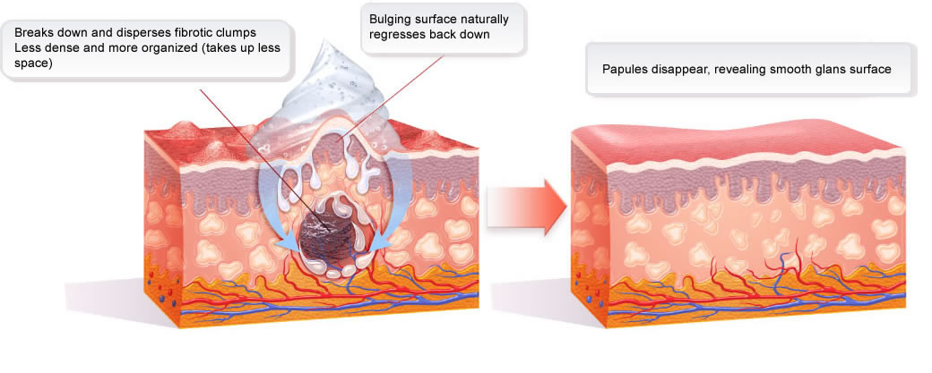 3P Gel’s unique dual-action therapy disperses the clumps of fibrotic tissue that are found deep under your pearly penile papules. These fibrotic clumps are what cause the penile surface to poke out and form unsightly bumps. 3P Gel naturally breaks down these fibrotic clumps and allows your raised penile papules to settle back down until they are completely gone.
